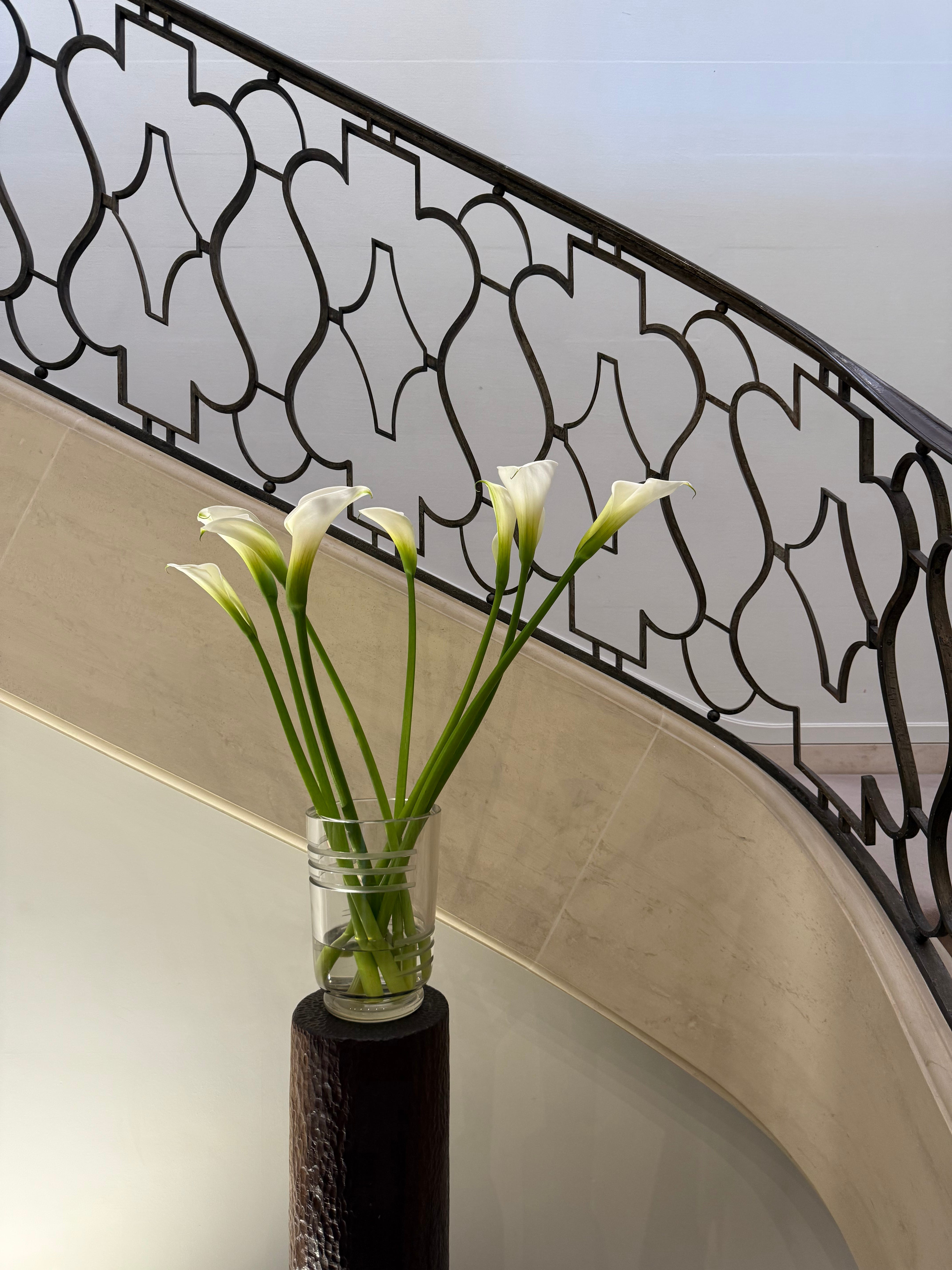 Single stem arrangements. I stay at The Mercer Hotel when I go to New York and they have such perfect flowers—always single stem. Last week, they had this incredible parrot tulip arrangement in my room, and at the front desk, there was a light blue Japanese delphinium that I just had to take a picture of for inspo. Similarly, in Paris, I took a picture of these gorgeous calla lilies from Castor Fleuriste.